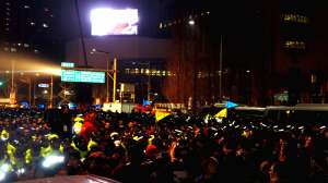 Traditional Korean drummers and dancers moved freely through the street and as we continued forward towards the main event stage. But eventually the flowing mass of people became too thick and we came to a congested stop. There was a stage with performances by some popular artists going which was blocked off by security guards. In addition the streets were lined with dozens of police buses. But the excitement quickly turned into an overwhelming claustrophobic feeling.