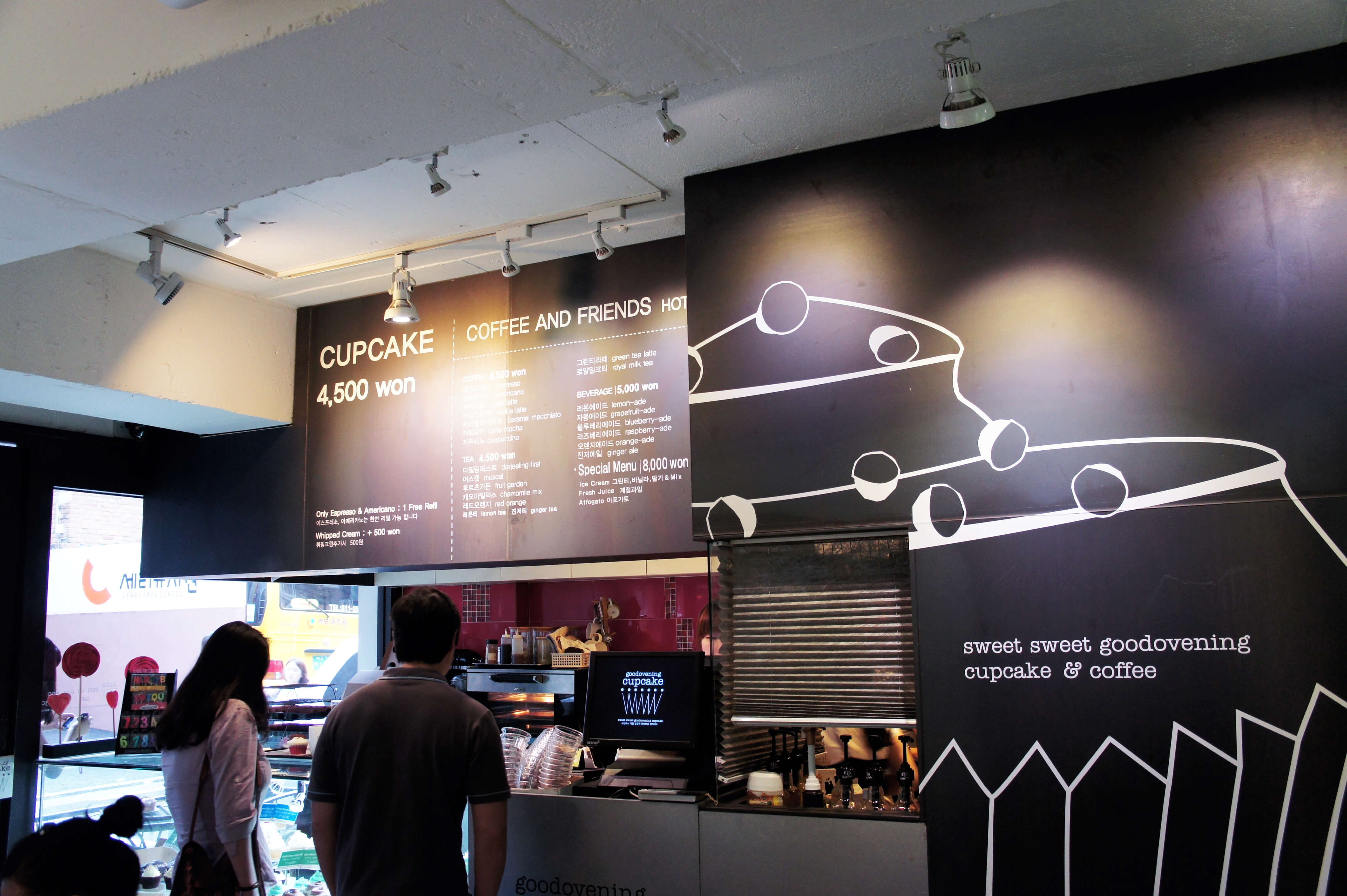 One weekend, the boyfriend and I were trudging through the rainy streets of 압구정 (Apgujeong). He had lost one of our random nonsensical bets and owed me coffee at a cafe of my choosing (Bwahahaa). Soooo, as we were browsing the vast selection of cafés on 가로수 길 (Garosugil), I remembered a place we had both been rather curious about, Good Ovening Cupcake. It’s a chain we see around pretty often, but never get around to visiting.