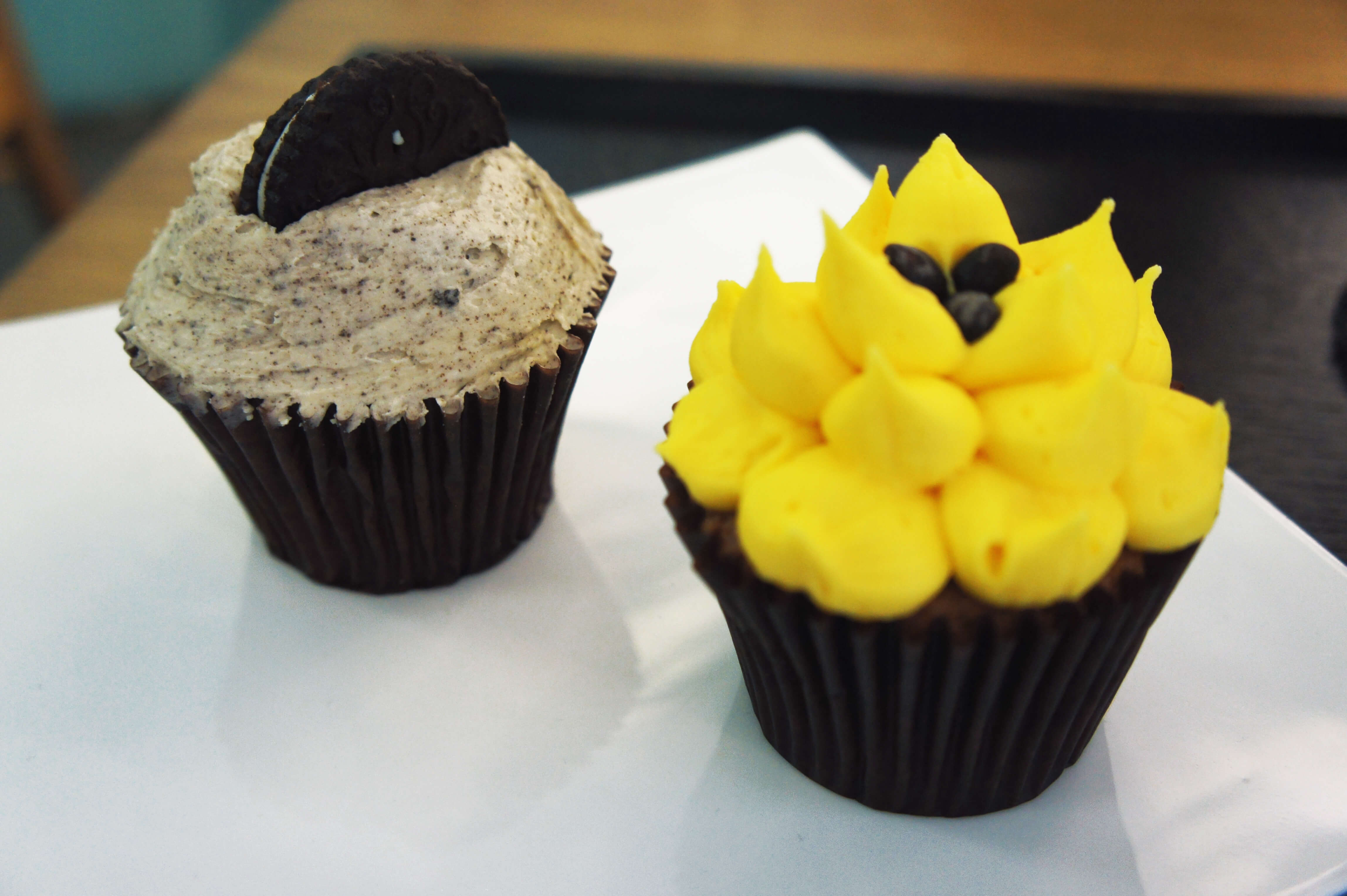 The Sunflower cupcake, on the other hand, had a slightly softer blueberry cake base with a candy flavored banana butter cream frosting. This one actually tasted just a tad bit less sugary and I liked it more than my choice up until I hit the blueberry jam filling. Don’t get me wrong, it wasn’t bad, but the the sugar overload sucker punched me in the face and put me into a sugar coma.