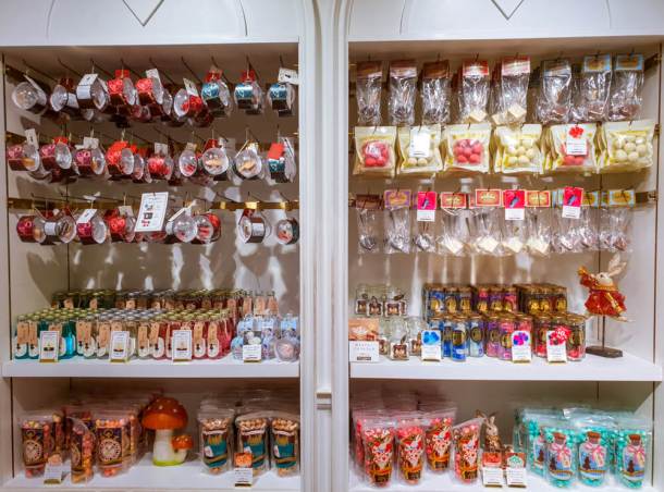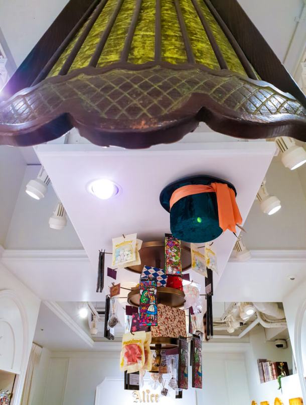 The store is super small, but filled to the brim with all sorts of lovely Alice themed accessories and knick-knacks. As you might have guessed, I was more interested in their adorable snacks. Books filled with cake, small soda bottles that said “drink me,” Cute decorative boxes with chocolates. There was just so much to choose from! I was beginning to see why it took people so long to come out of the store.