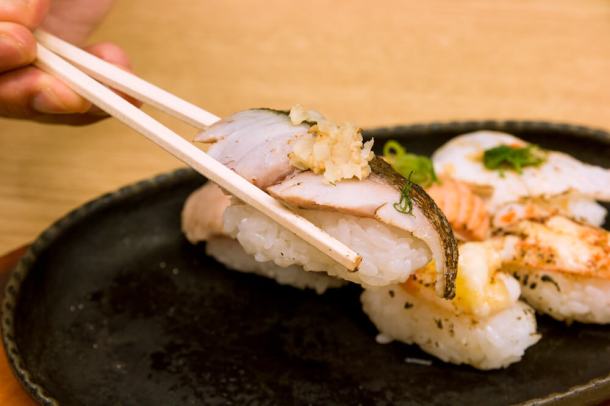The restaurant is quite small and can get very busy, but luckily we only had to wait about 10 minutes before being seated. They provided us with English menus with large pictures, which made ordering oh so easy. So, we eagerly ordered the “Standard Sushi” which came with 12 pieces for 1,200 Yen along with the “Sushiyaki” which came with 8 pieces of lightly grilled sushi for 1,200 Yen.
